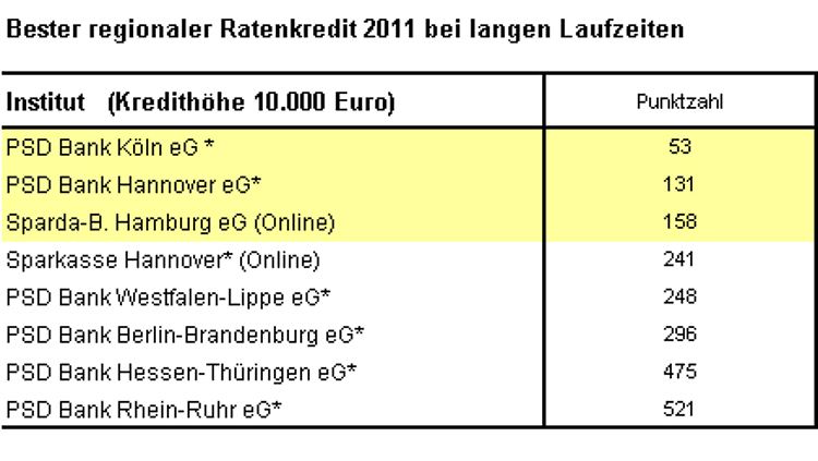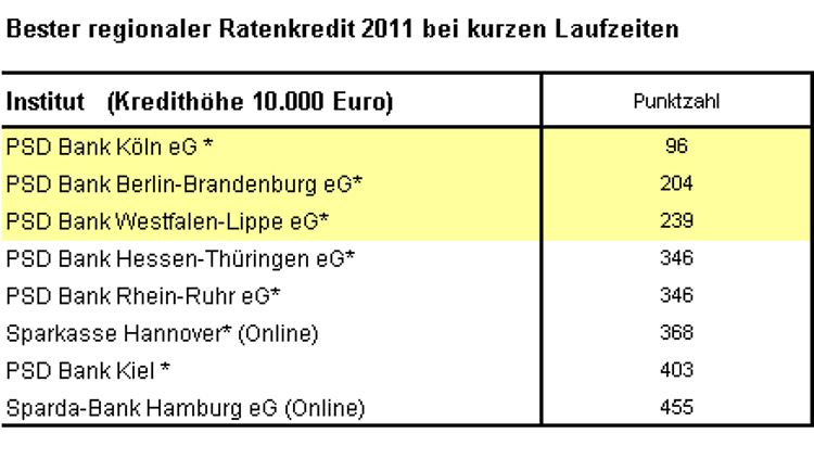 Bei den kurzen Kredit-Laufzeiten setzte sich regional die PSD Bank Köln eG an die Spitze. Überregional punktete C&A Money mit dem attraktivsten Angebot. Auch bei den langen Laufzeiten entschied die PSD Bank Köln eG das Rennen für sich. Überregional überzeugte die SKG Bank mit ihrem Angebot am stärksten.