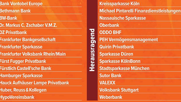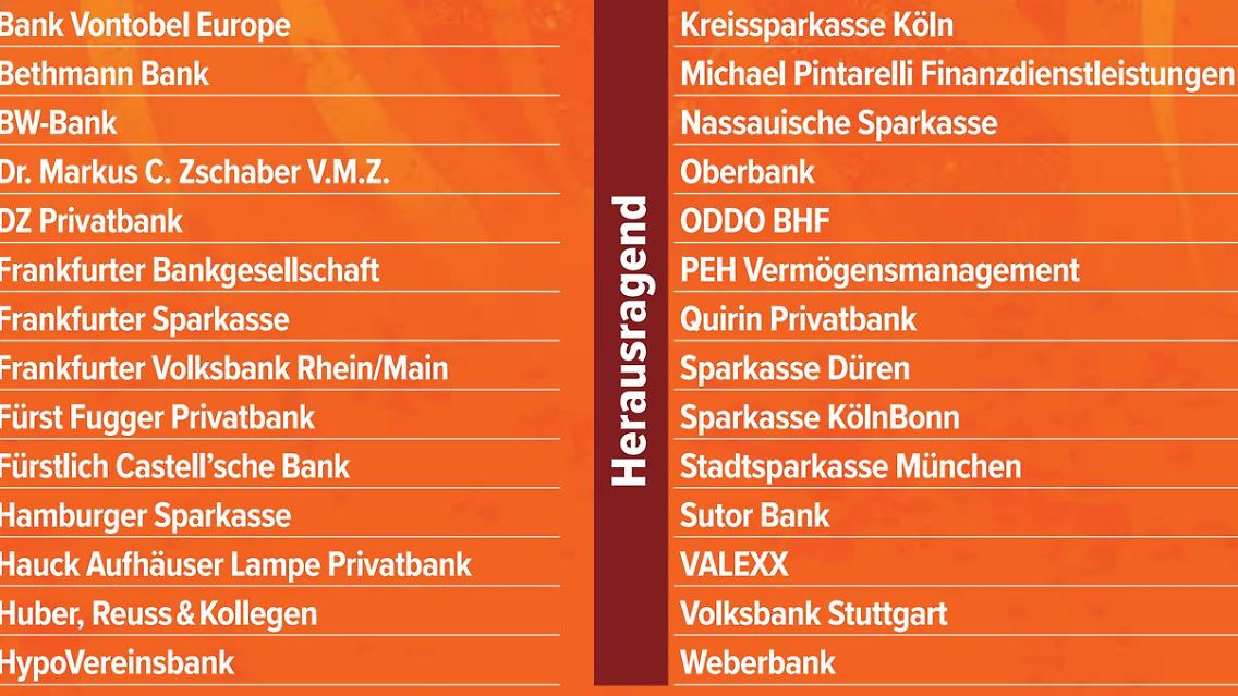 Diese 18 Bankhäuser und Vermögensverwaltungen zeigten beim diesjährigen Test herausragende Leistungen. In alphabetischer Reihenfolge: