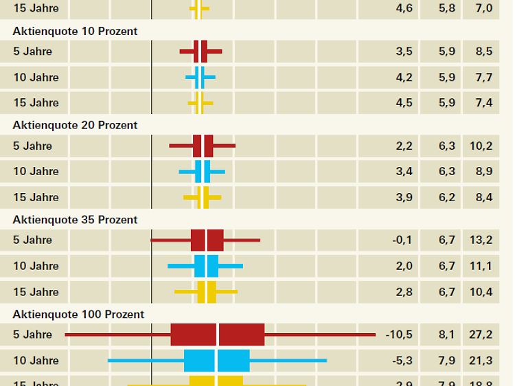 Um ihre Empfehlung zu untermauern, haben die Tester basierend auf den Daten der letzten 43 Jahre je 10.000 Fünf-, Zehn- und Fünfzehnjahreszeiträume simuliert und berechnet, wie sich die jeweilige Mischung aus Festverzinslichen Anlagen und Aktien verhalten hätte. Dabei standen der Anleihenindex "Rex 1 Jahr" und der Aktienindex MSCI Welt Pate.