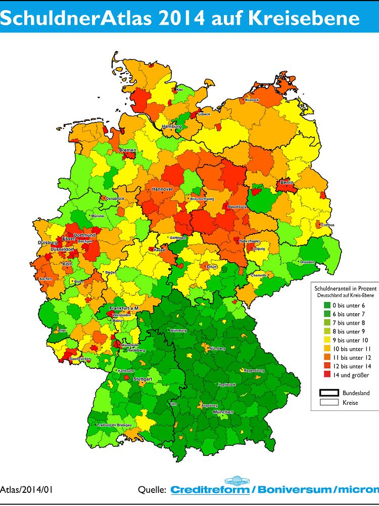 Bundesweite Spitzenreiter bei der Überschuldung sind Bremerhaven mit einer Quote von 20,41 Prozent sowie Pirmasens (18,34 Prozent) und Offenbach am Main (18,04 Prozent). Die positive Liste mit den niedrigsten Schuldnerquoten wird von drei Städten in Bayern angeführt: In Eichstätt liegt die Zahl mit 3,67 Prozent nicht mal halb so hoch wie der Durchschnitt und auch in Erlangen-Höchstadt und in Schweinfurt haben weniger als fünf Prozent der Bürger ein Schuldenproblem. Im Vergleich der Bundesländer steht Bayern dann auch am besten da, gefolgt von Baden-Württemberg und Thüringen. Schlusslichter im bundesweiten Vergleich sind Bremen und Berlin. Hier liegen die Schuldnerquoten bei über 13 Prozent. Auch in Sachsen-Anhalt sind die Schuldnerzahlen weit überdurchschnittlich und die Situation hat sich im letzten Jahr spürbar verschlechtert.