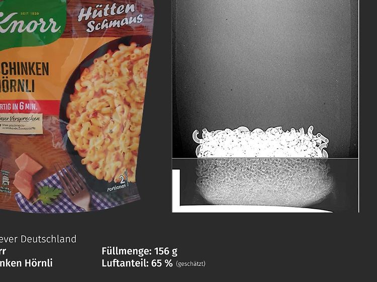Dass dies kein Einzelfall ist, zeigt eine aktuelle Stichprobe der VZHH. Zwischen 50 und 95 Prozent liegt der geschätzte Luftanteil bei insgesamt 15 beispielhaft auf Basis von Verbraucherbeschwerden ausgewählten Produkten, die die Verbraucherschützer mithilfe von Röntgenaufnahmen haben durchleuchten lassen.