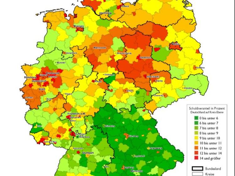 Die Konjunktur in Deutschland brummt und dennoch können immer mehr Menschen ihre Rechnungen nicht mehr bezahlen. Im Vergleich zum Vorjahr ist die Zahl der überschuldeten Personen um rund 65.000 auf über 6,9 Millionen gestiegen, wie die Wirtschaftsauskunftei Creditreform in ihrem Schuldenatlas 2017 berichtet . Zum Stichtag 1. Oktober 2017 wurde für die gesamte Bundesrepublik eine Überschuldungsquote von 10 Prozent gemessen - bei rund jedem zehnten Bürger über 18 Jahre sind die Gesamtausgaben dauerhaft höher als die Einnahmen. Die Überschuldungsquote pro Kopf ist zwar leicht gesunken, was aber vor allem an der Bevölkerungszunahme liegt.
