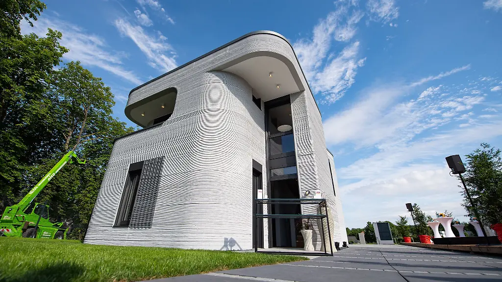 In dem betongrauen Kubus verteilen sich 160 Quadratmeter Wohnfläche auf Erd- und Obergeschoss. Auffallend sind die abgerundeten Ecken und die feinlinierte Struktur der Wände: Beim 3D-Druck von Häusern trägt eine Düse das Baumaterial - meist eine Mischung aus Beton und verschiedenen Zusätzen - in zentimeterdünnen Schichten auf. So als würde ein Konditor mit einem Spritzbeutel voller Sahne eine Torte dekorieren.