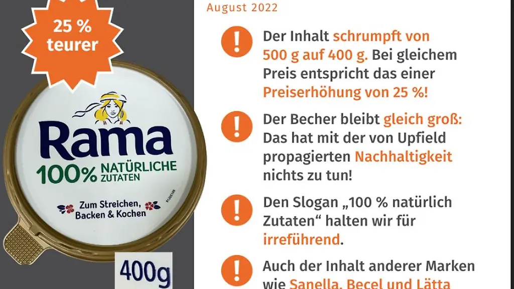 In diesem Monat bekommt das Streichfett Rama des US-Herstellers Upfield den Titel "Mogelpackung des Monats" von der Verbraucherzentrale Hamburg (VZHH) verliehen. Denn seit Kurzem füllt der Hersteller bei seinem Klassiker nur noch 400 Gramm Margarine pro Becher ab statt wie bisher 500 Gramm. Der Preis blieb aber bei vielen verschiedenen Händlern trotzdem konstant bei meist 2,19 Euro. Unterm Strich entspricht das einer versteckten Preiserhöhung von 25 Prozent.