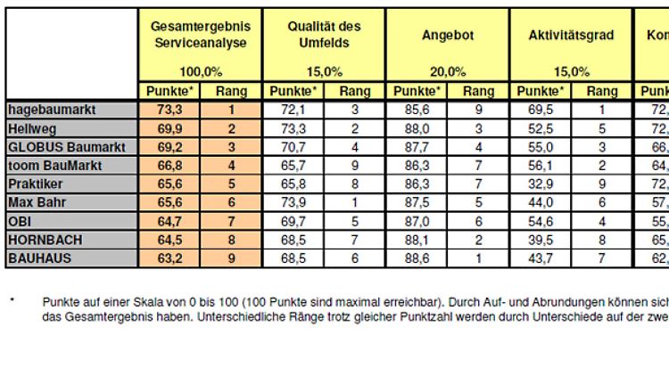 Insgesamt ist die Servicequalität der Branche befriedigend. Einen Anbieter, der in allen Bereichen glänzt, gibt es zwar nicht. Dennoch darf sich ein Unternehmen mit dem Titel "Bester Baumarkt 2010" schmücken: Hagebaumarkt überzeugte mit kurzen Wartezeiten an der Kasse und am Informationsschalter. Viel Lob gab es für die gut geschulten, hilfsbereiten Mitarbeiter: Sie berieten individuell, kompetent und verständlich. Offenbar keine Selbstverständlichkeit: In fast 40 Prozent aller Fälle war die Beratung nicht korrekt oder unvollständig. Bei fast der Hälfte aller Testgespräche gingen die Mitarbeiter zudem zu wenig auf die Kundenbedürfnisse ein. Beim Angebotsvergleich schnitt Hagebaumarkt geringfügig schlechter ab als die Konkurrenz, wurde in diesem Punkt aber immer noch "sehr gut" bewertet.