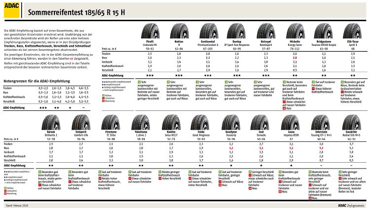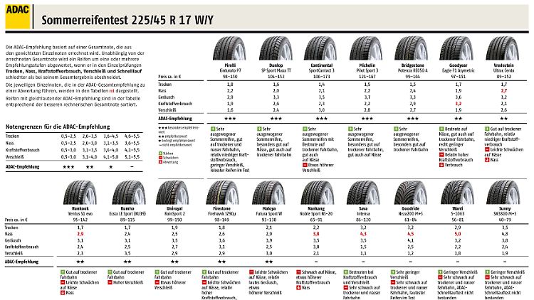 Bestleistungen im Kraftstoffverbrauch und Verschleißverhalten stehen in der Regel im Zielkonflikt zum Verhalten auf nasser Straße. Bestes Beispiel dafür ist der Interstate IST-1 M+S mit Bestnoten bei der Haltbarkeit und beim Rollwiderstand. Sein mangelhafter Nässewert führt zur Abwertung auf "nicht empfehlenswert". Ebenso verpasst der sehr kraftstoffsparende und verschleißarme Michelin Energy Saver wegen etwas schwächerer Nasswerte das Prädikat "besonders empfehlenswert". Um also einen Spitzenplatz im Reifentest zu erhalten, kommt es darauf an, in möglichst allen Testdisziplinen gute Werte zu zeigen und in keiner einzigen schwach abzuschneiden. Der Sommerreifentest zeigt einmal mehr, dass sich beim Reifenkauf ein Preisvergleich lohnt. Die Preisspannen reichen bis zu 70 Prozent (Vredestein Ultrac Cento).