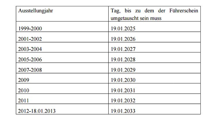 Die 15 Millionen Fahrerlaubnisse, die bis zum 31. Dezember 1998 ausgestellt wurden, sollen nach einer Empfehlung des Verkehrsausschusses bis spätestens 2033 wie in der Grafik abgebildet aus dem Verkehr gezogen werden. Hier ist für das Umtauschdatum das Geburtsjahr des Führerscheininhabers ausschlaggebend.