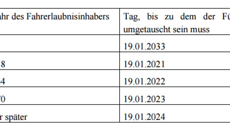 Aber auch ältere Fahrerlaubnisse bekommen ein Verfallsdatum, bis zu dem sie spätestens auf eigene Kosten umgetauscht werden müssen. Und das früher als geplant. Denn eigentlich sollten alle bis 2013 ausgestellten Führerscheine noch bis 2033 ihre Gültigkeit behalten. Doch nun sollen auf Empfehlung des Verkehrsausschusses im Bundesrat, abgestuft nach Geburtsjahrgängen, auch alle restlichen 45 Millionen Führerscheine vorzeitig ausgetauscht werden. Mit dem vorgezogenen Umtausch sollen die Behörden entlastet und das Verfahren entzerrt werden. Grund zur Eile besteht jedoch nicht. Der früheste Umtauschtermin liegt vermutlich nicht vor dem Jahr 2021.