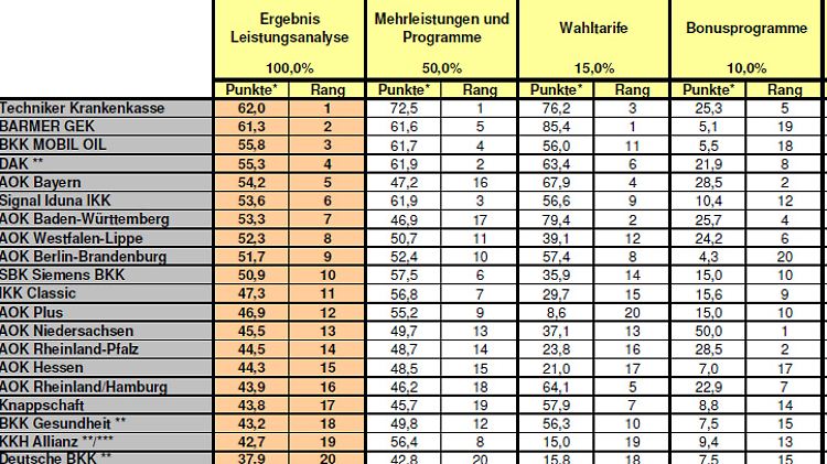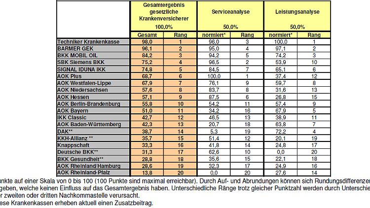 Als Gesamtsieger geht die Techniker Krankenkasse aus dem Test hervor. Die Kasse bot Top-Service und hatte das beste Leistungsangebot. Überzeugend wirkte die freundliche und kompetente Beratung am Telefon. Zudem eroberte die Kasse den Spitzenplatz in der Kategorie "Mehrleistungen und Programme". Zum Leistungsspektrum gehören beispielsweise alternative Behandlungsmethoden, integrierte Versorgung und Kuren für Erwachsene und Kinder.