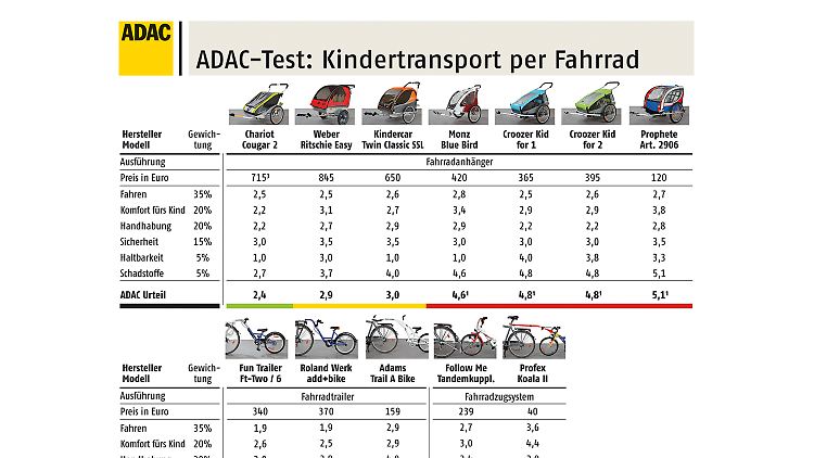 Bester Fahrradanhänger im Test wurde der Chariot Cougar 2 mit der Gesamtnote "gut". Schlusslicht bei den reinen Fahrradanhängern wurde der Prophete Art 2906, nicht nur wegen der höchsten Schadstoffwerte. Auch bei Regen bietet er demnach kaum Schutz. Allerdings ist er schon für 120 Euro zu haben, der teuerste Anhänger kostet fast 850 Euro. Bei den Fahrradzugsystemen erwies sich laut ADAC die Tandemstange Profex Koala II wegen schlechter Haltbarkeit als "mangelhafter" Totalausfall.