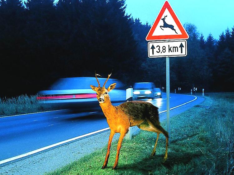Jährlich werden rund 200.000 Rehe bei Unfällen mit Autos getötet. Besonders gefährlich sind neu gebaute Straßen, die durch Waldgebiete führen, da das Wild seinen gewohnten Wechsel beibehält. Falls ein Reh auftaucht, muss mit weiteren Tieren gerechnet werden. Dann sollte man nicht nur abbremsen, sondern auch hupen. Ist ein Zusammenprall nicht mehr zu vermeiden, auf keinen Fall ausweichen, denn das könnte noch schlimmere Folgen haben.