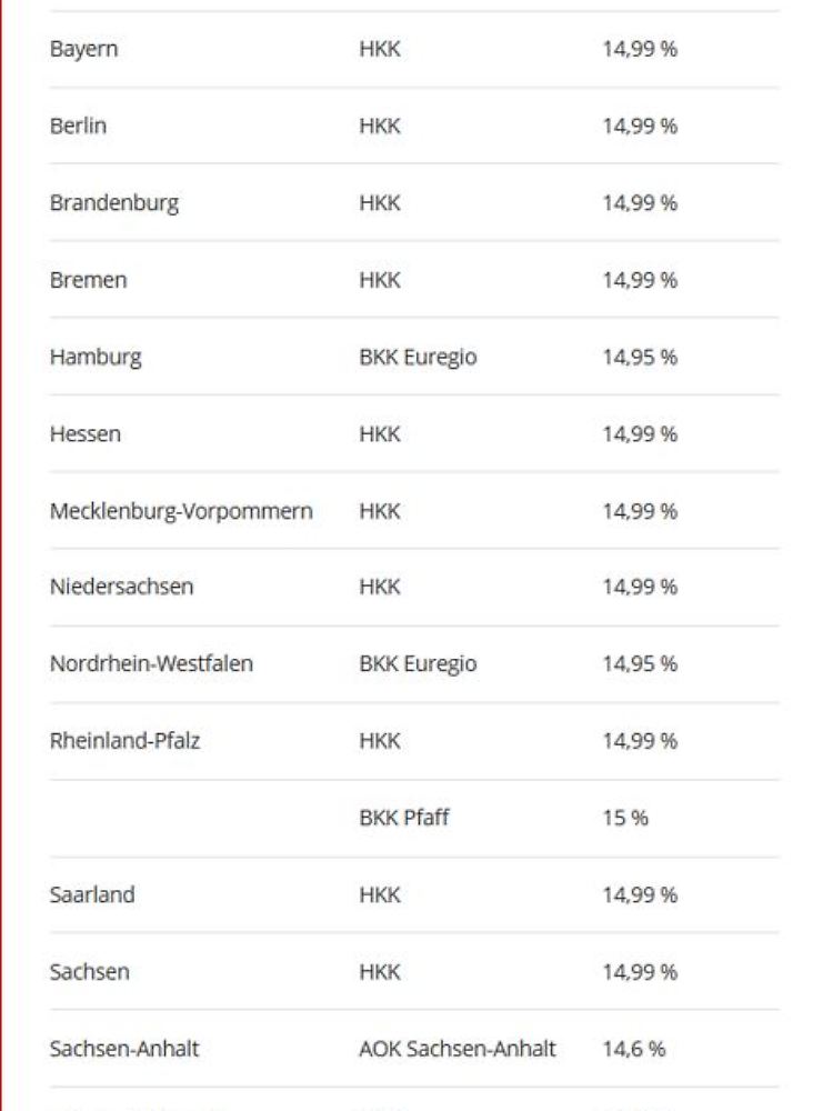 Die günstigste bundesweite ist die HKK, die liegt bei 14,99 Prozent Beitrag. Regional toppt das noch in Hamburg die BKK Regio mit 14,95 Prozent. In Sachsen-Anhalt nimmt die dortige AOK gar keinen Zusatzbeitrag. Hier kann man sich also für 14,6 Prozent versichern.
