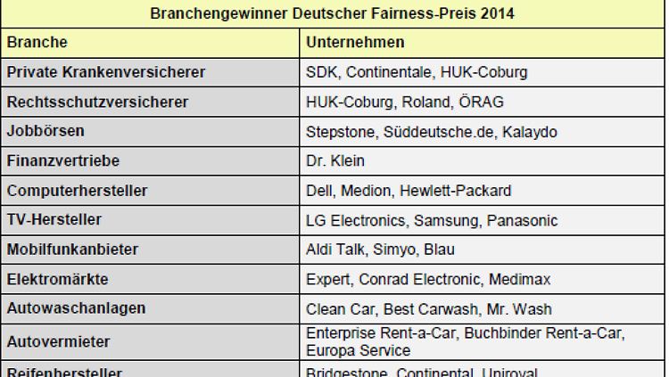 Das Deutsche Institut für Service-Qualität führte in Kooperation mit n-tv eine umfangreiche Verbraucherbefragung zum Thema Fairness durch. Rund 350 Unternehmen kamen in die Auswertung. Aufgrund des Urteils der Befragten wurden die fairsten Unternehmen in insgesamt 31 Branchen ausgemacht. Diese wurden jetzt in Berlin erstmals mit dem Deutschen Fairness-Preis 2014 ausgezeichnet.