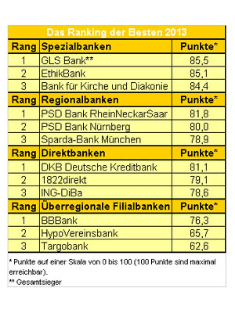 Spezialbanken: Bank des Jahres in dieser Kategorie und auch Gesamtsieger wurde die GLS Bank. In den Leistungsbereichen Online-Kommunikation und Preis-Leistungs-Verhältnis erzielte das Institut im Wettbewerbsvergleich die höchsten Zufriedenheitswerte. Positiv fielen auch das Kundenvertrauen sowie die Weiterempfehlungsbereitschaft gegenüber der Bank aus.