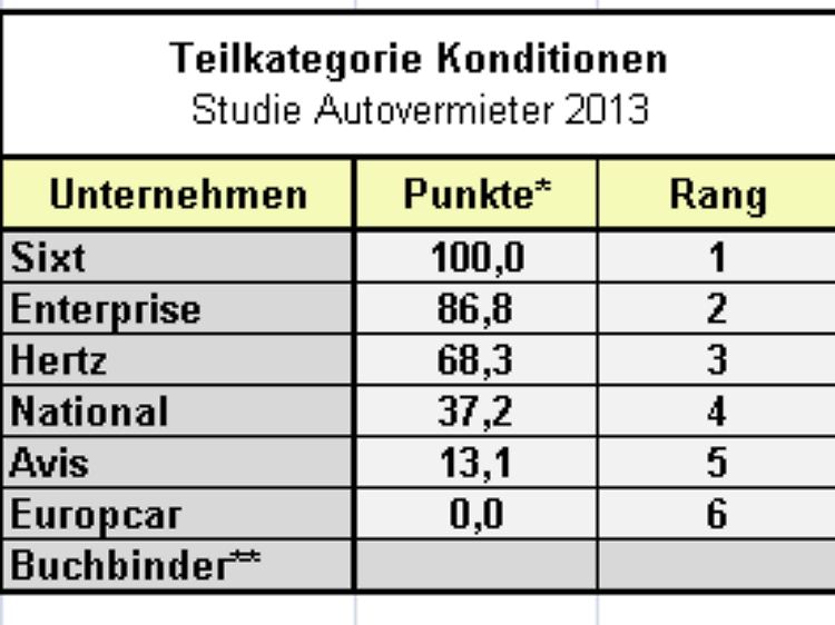 Testsieger und damit "Bester Autovermieter 2013" wurde der Anbieter Sixt. Das Unternehmen bot nicht nur die im Durchschnitt günstigsten Konditionen, sondern konnte auch beim Service überzeugen: Eine sehr gute E-Mail-Bearbeitung, der beste telefonische Service sowie ein guter Internetauftritt trugen zum letztlich deutlichen Testsieg bei. Auf Rang zwei platzierte sich der Autovermieter Enterprise. Ausschlaggebend waren vor allem die günstigen Konditionen für Fahrzeugtypen unterhalb der gehobenen Mittelklasse. Beim telefonischen Service punktete das Unternehmen mit den kürzesten Wartezeiten und kompetenten Auskünften. Dritter im Gesamtergebnis wurde Hertz. Das Unternehmen belegte auch in den beiden Bereichen Service und Konditionen jeweils Rang drei.