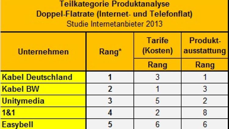 Als Testsieger ging Kabel Deutschland aus der Studie hervor. Der Internetanbieter überzeugte mit dem besten Service und bot die im Schnitt besten Doppel-Flatrate-Produkte. In der Serviceanalyse punktete der Anbieter in allen Bereichen – mit sehr guter E-Mail-Bearbeitung, sehr guter telefonischer Beratung und dem ersten Rang im Teilbereich Internet. Kurze Wartezeiten bis zur E-Mail-Antwort und an der Hotline sowie zahlreiche Informationen und Tools auf den Internetseiten stehen nur beispielhaft für eine Servicequalität, die sich das Urteil „sehr gut“ verdiente.