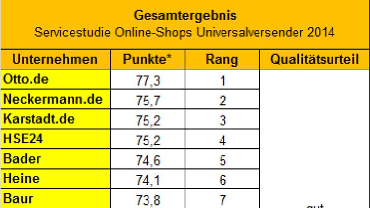 Testsieger der Studie "Online-Shops Universalversender 2014" wurde Otto.de (Qualitätsurteil: "gut"). Sowohl der Internetauftritt als auch die E-Mail-Bearbeitung erzielten ein sehr gutes Ergebnis. Beim Versand bot der Anbieter im Vergleich mit die beste Qualität der Warenlieferung.