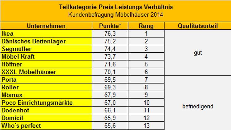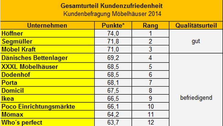 Im Gesamturteil erzielten nur drei Möbelhäuser das Qualitätsurteil "gut", die weiteren elf Unternehmen "befriedigend". Dabei zeigten sich über 72 Prozent der Befragten mit dem Warenangebot der Möbelhäuser zufrieden – kein anderer Bereich schnitt in den Augen der Kunden besser ab.