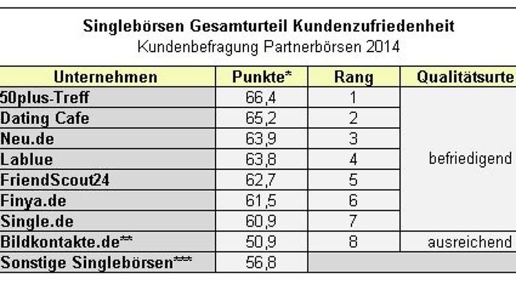 Das Urteil der Befragten fiel insgesamt nur befriedigend aus – keine einzige Singlebörse und auch keine Online-Partnervermittlung erzielte das Qualitätsurteil "gut". Bezeichnend war, dass über 16 Prozent der Singlebörsen-Kunden angaben, sich schon einmal über ihren Anbieter geärgert zu haben. Ausbleibender Erfolg bei der Partnersuche und unseriöse Zuschriften waren die am häufigsten genannten Gründe. Bei den Partnervermittlungen hatte ebenfalls ein hoher Anteil von rund zwölf Prozent bereits ein Frusterlebnis. Deren Kunden monierten am häufigsten die hohen Kosten sowie unpassende Partnervorschläge.