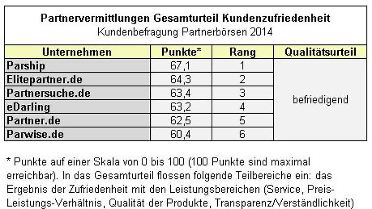 Als beliebteste Online-Partnervermittlung 2014 ging Parship aus der Kundenbefragung hervor. Das Unternehmen überzeugte unter anderem mit den höchsten Kundenzufriedenheitswerten in Bezug auf die Qualität der Mitglieder und die Leistungen der Partnersuche. Auch die Weiterempfehlungsbereitschaft war unter den Parship-Kunden am höchsten ausgeprägt. Auf den Plätzen zwei und drei folgten Elitepartner.de und Partnersuche.de.