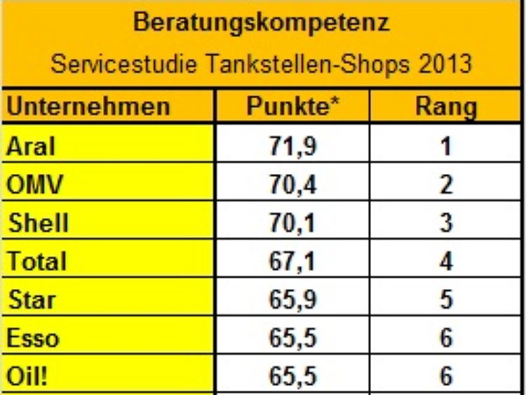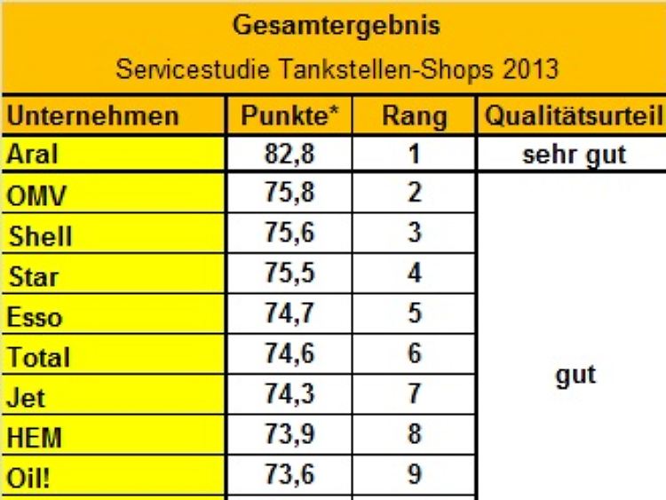 Testsieger und damit "Bester Tankstellen-Shop 2013" wurde Aral. Das Unternehmen überzeugte in allen getesteten Bereichen mit der besten Leistung. Die Qualität der Speisen und Getränke war bei keinem anderen Anbieter besser. Insbesondere die Schmackhaftigkeit und Frische der Produkte wurden gelobt. In den Shops fiel die ansprechende und behin-dertengerechte Gestaltung positiv auf. Darüber hinaus erleichterten Wandbeschriftungen den Kunden das Auffinden der Waren. An der Kasse und bis zur Aufgabe der Bestellung musste nur kurz gewartet werden. Die Angestellten dieser Tankstellenkette gingen individuell auf die Kundenbedürfnisse ein und beantworteten Fragen überwiegend vollständig. Dabei waren sie sehr freundlich wie auch hilfsbereit und reagierten auf Beschwerden und Reklamationen sehr professionell.