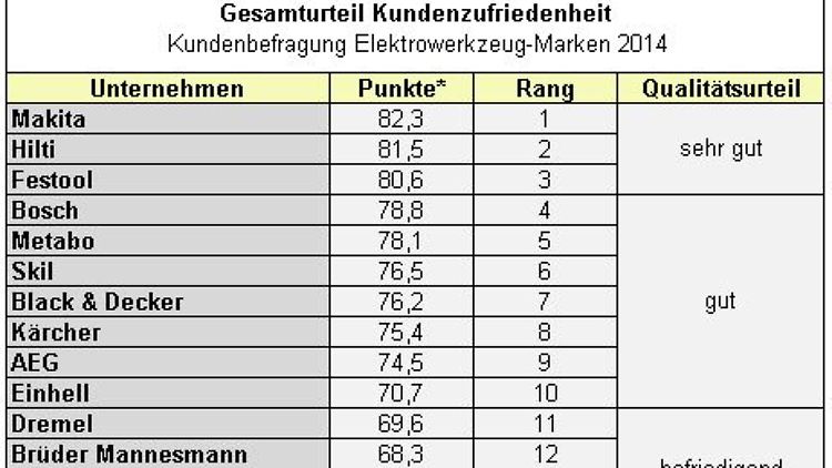 Den zweiten Rang nahm Hilti ein. Die bekannte Marke punktete vor allem durch die hohe Weiterempfehlungsbereitschaft seitens der Nutzer, die bei keinem anderen Hersteller so ausgeprägt war. Auch Eigenschaften und Funktionen sowie das Image wurden von den Hilti-Kunden im Vergleich am besten bewertet. Auf dem dritten Rang platzierte sich Festool. Die Marke überzeugte vor allem durch die Handhabung, die von fast 98 Prozent der Kunden positiv bewertet wurde. Auch hinsichtlich des Preis-Leistungs-Verhältnisses, der Garantie und des Designs erzielte die Marke die höchsten Kundenzufriedenheitswerte.