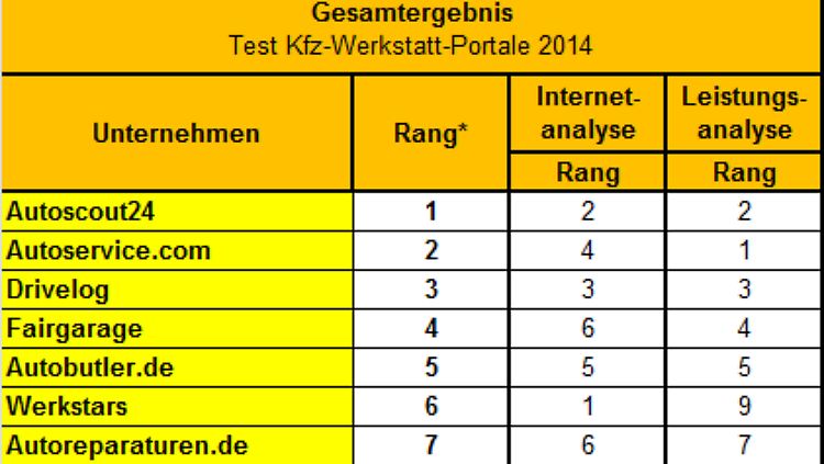 Testsieger der Studie "Kfz-Werkstatt-Portale 2014" wurde Autoscout24 mit dem Gesamturteil "gut". Der Werkstatt-Dienst überzeugte mit einem guten Internetauftritt wie auch einem guten Ergebnis in der Leistungsanalyse. Autoscout24 lieferte für alle Musterfallanfragen mehrere, unmittelbar vergleichbare Angebote verschiedener Kfz-Werkstätten. Ein Vergleich war für alle wichtigen Standard-Werkstattleistungen durchführbar. Auch eine Terminvereinbarung mit dem ausgewählten Kfz-Betrieb war online möglich.