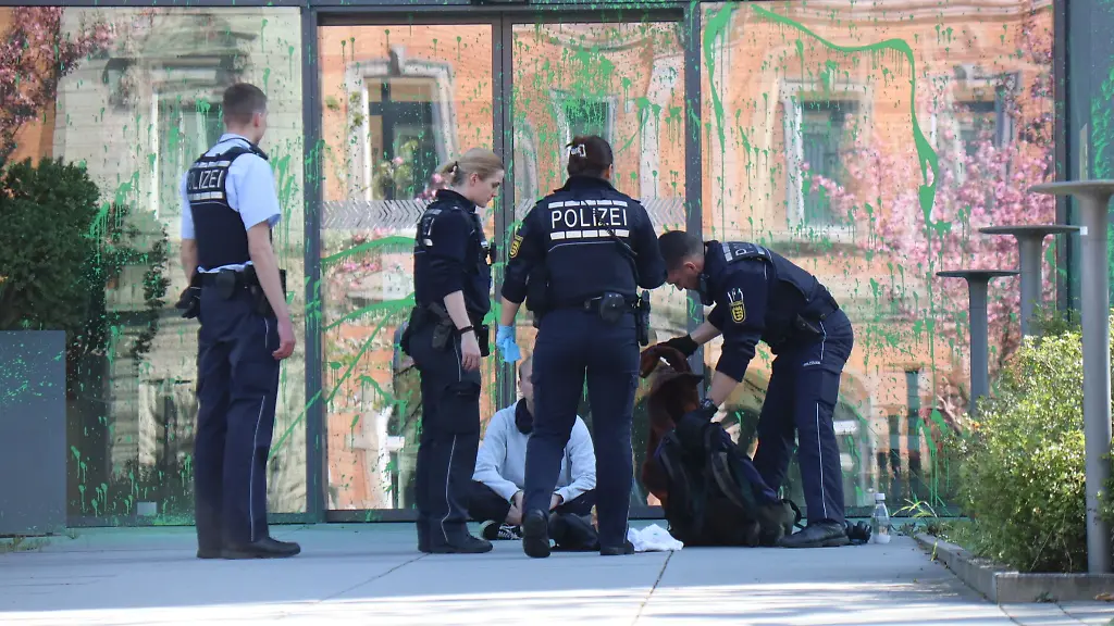 Ein Mann beschmiert ein Unternehmensgebäude mit grüner Farbe. Es meldet sich eine Aktivistengruppe zu Wort.