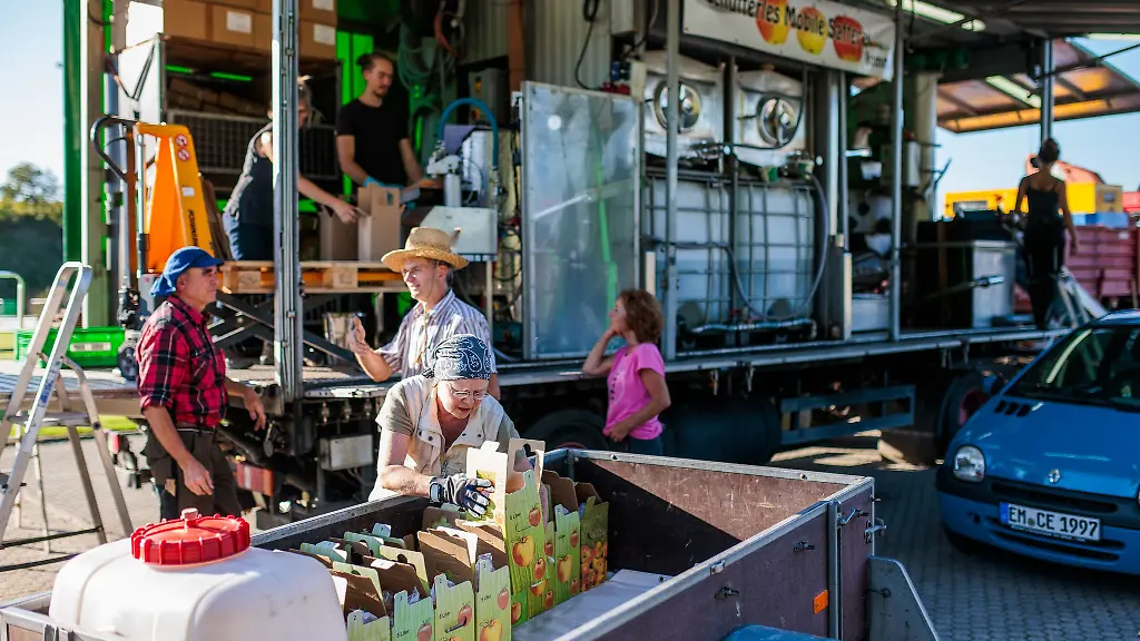 Markus Schütterle aus Seefelden (Breisgau-Hochschwarzwald) hat eine mobile Safterei. Mit seiner Anlage, in der sich alles findet, was man zum Pressen braucht, bedient er private Obstbesitzer zwischen Offenburg und Wehr am Oberrhein. Manche kommen mit 150 Kilogramm an, manche mit 300 oder 400 Kilogramm.