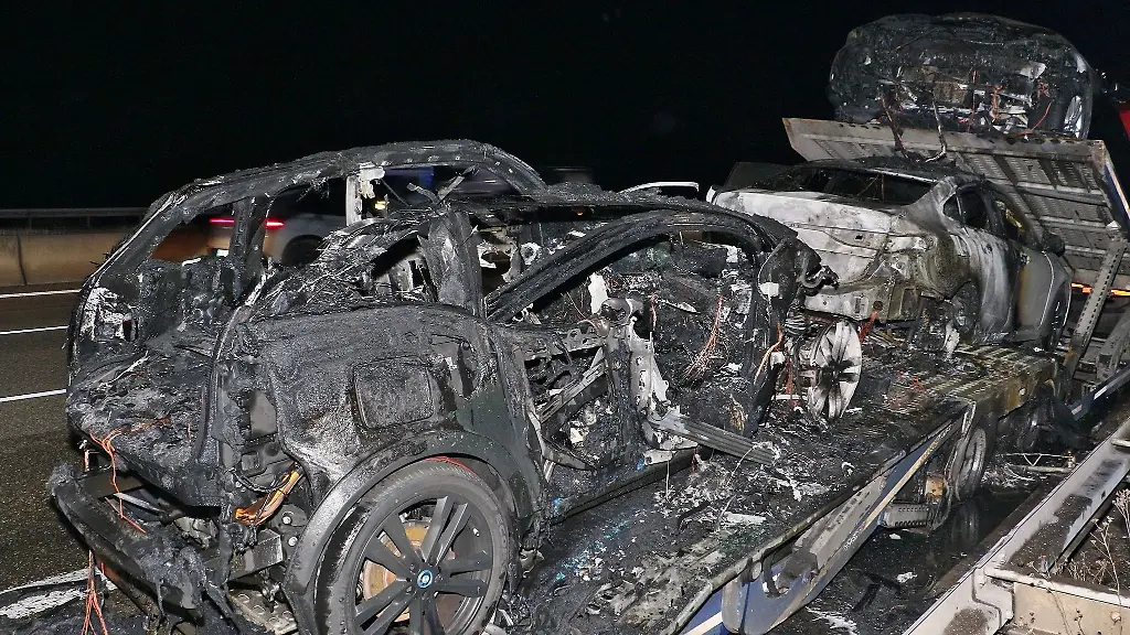 Dadurch kam es zu Funkenflug, im weiteren Verlauf bildeten sich Flammen. Der 25-jährige Fahrer stoppte den Transporter auf dem Standstreifen und verließ ihn unverletzt. Das Feuer griff den Angaben der Mitteilung zufolge auf drei der vier geladenen Fahrzeuge über, wie es weiter hieß. Zwei davon, darunter ein E-Auto, brannten komplett aus, ein drittes Fahrzeug wurde ebenfalls beschädigt. Das vierte Auto blieb den Angaben zufolge unversehrt. Zu einem früheren Zeitpunkt hatte die Polizei die Zahl der geladenen Autos zunächst mit drei angegeben.