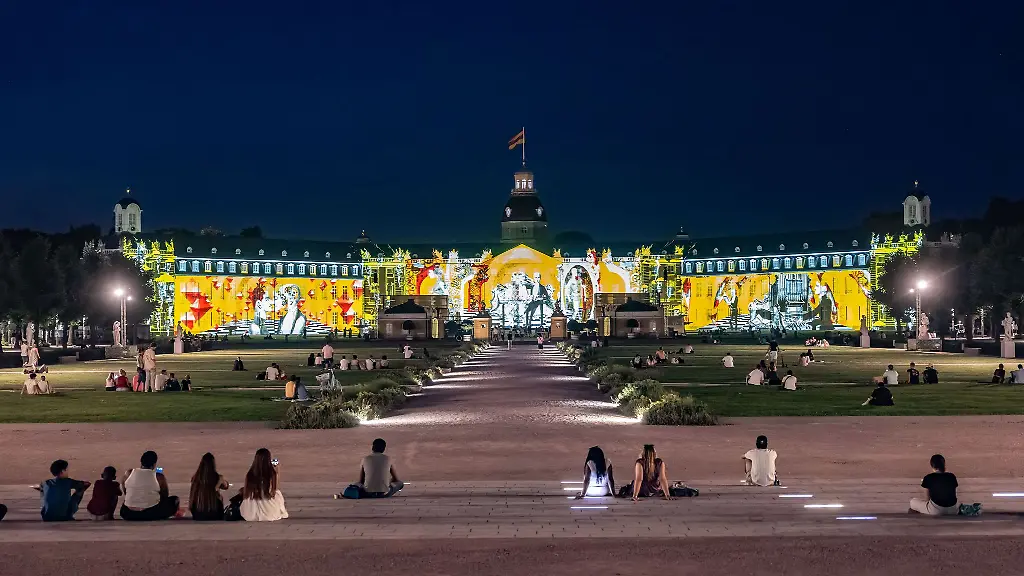 Karlsruhe (dpa/lsw) - Wer in den kommenden Wochen kostenlos den Abend in ganz besonderes Licht rücken will, sollte zum Karlsruher Schloss kommen. Bis zum 14. September bespielen die Schlosslichtspiele allabendlich nach Einbruch der Dunkelheit die 170 Meter breite Barockfassade.