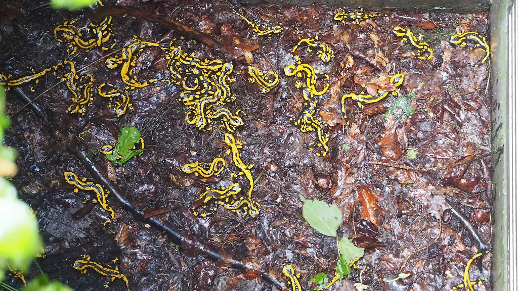 Erwachsene Feuersalamander wandern jedes Jahr zu ihren Laichgewässern, um ihre Jungen zu bekommen. Dieses Mal wurde ihnen im Zollernalbkreis ein Schacht zum Verhängnis.