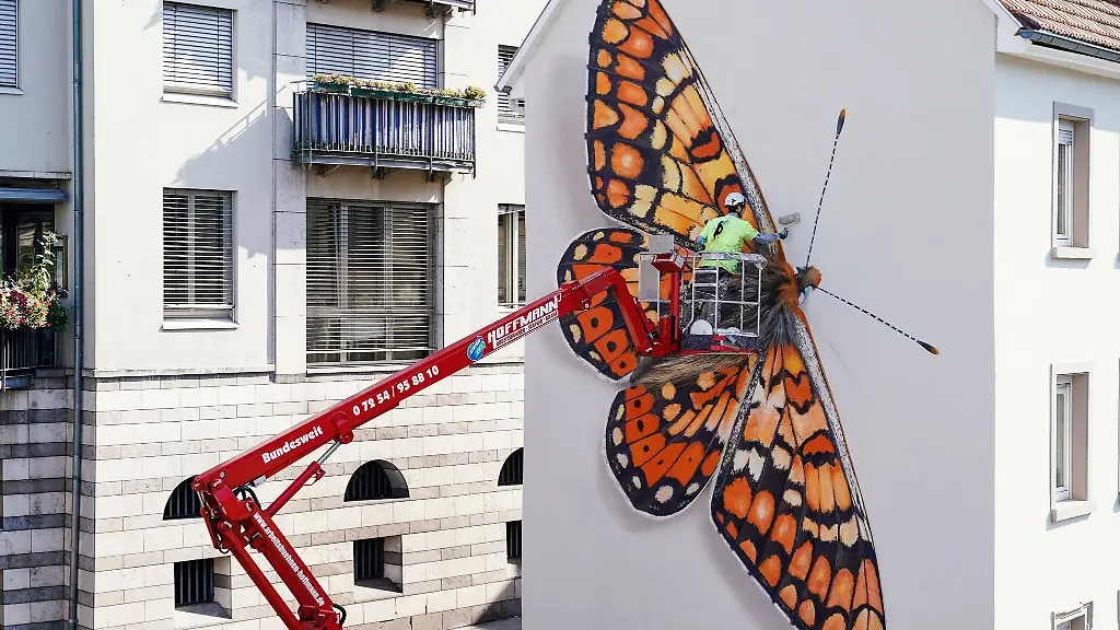 Heidelberg (dpa/lsw) - Mit einem überdimensionalen Bild eines vom Aussterben bedrohten Schmetterlings wollen Forschende der Universität Heidelberg auf den Verlust der Artenvielfalt aufmerksam machen. Über mehrere Tage hat der französische Streetart-Künstler Mantra das Bild eines Skabiosen-Scheckenfalters auf eine Hauswand in Heidelberg gemalt. Am Wochenende stellte er die Arbeit fertig. Der Schmetterling steht nach Angaben der Universität dabei beispielhaft für eine Vielzahl von Arten, die vom Aussterben bedroht sind.