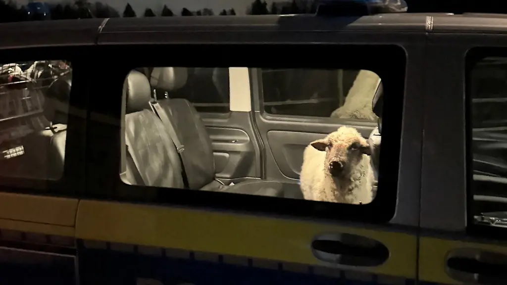 Streifenwagen statt Weide: Auf einer Landstraße ist ein entlaufenes Schaf unterwegs. Warum das Tier als "Gefangener" in einem Polizeiauto landet.