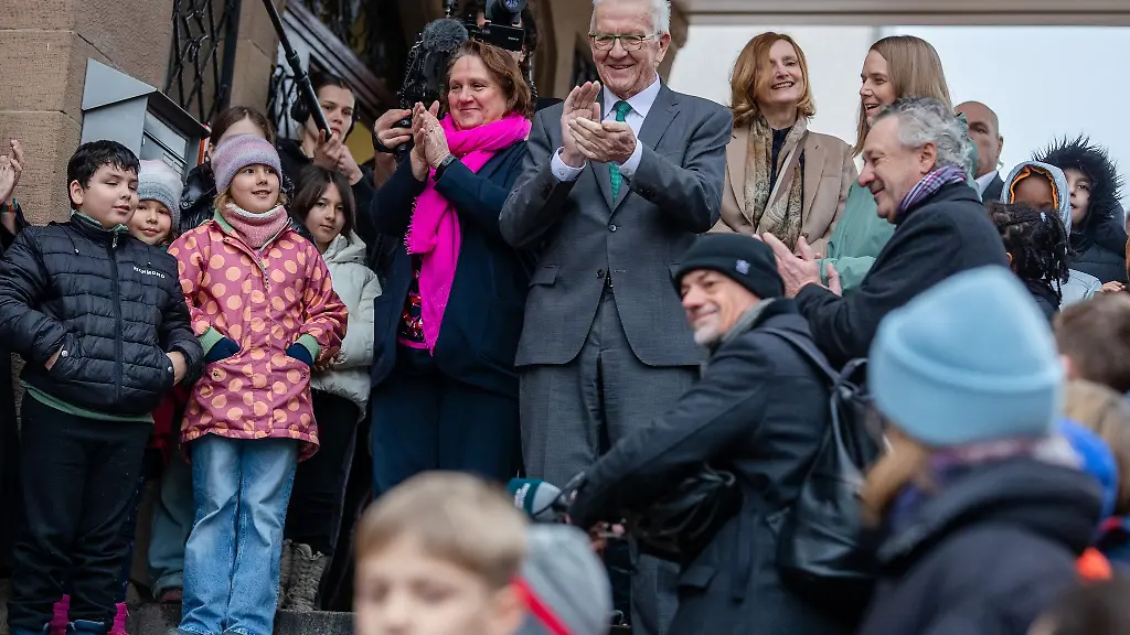 Stuttgart (dpa/lsw) - Der Empfang an der Pragschule fällt für Ministerpräsident Winfried Kretschmann und seine Kultusministerin Theresa Schopper wohl freundlicher aus als bei den meisten anderen Terminen. Schülerinnen und Schüler stehen Spalier auf der Treppe zur Eingangstür, singen den Schulsong und winken den beiden freundlich zu.