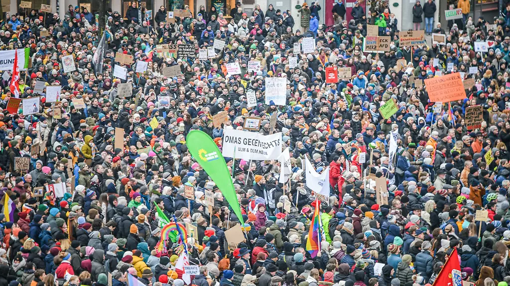 Rund 5.500 Menschen kamen nach Angaben der Polizei am Sonntag in Ulm zusammen - und damit mehr als zunächst erwartet. Die Veranstalter sprachen sogar von 10.000 Teilnehmern. Die Demonstration auf dem zentralen Münsterplatz stand unter dem Titel "Nie wieder ist jetzt. Gemeinsam für unsere Demokratie". Unter den Rednern war auch Ulms Oberbürgermeister Martin Ansbacher (SPD).