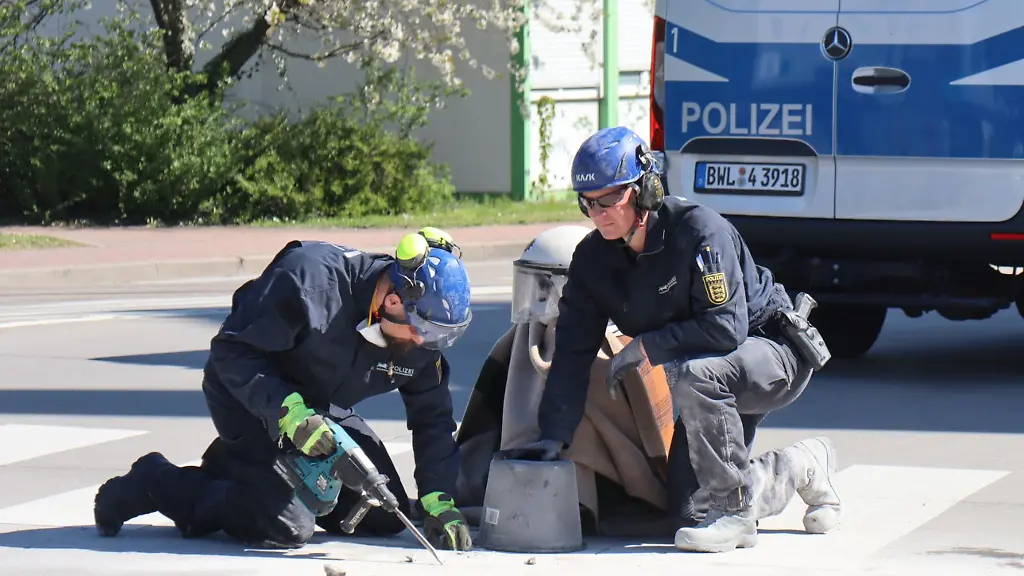Die Aktion startete laut Polizei gegen 7.30 Uhr. Der letzte Aktivist wurde gegen 15.30 Uhr von der Straße geholt. Anschließend wurde die Zufahrt wieder freigegeben. Die örtliche Polizei habe Unterstützung durch Experten vom Polizeipräsidium Einsatz erhalten, um die Menschen vom Boden zu lösen, sagte eine Sprecherin.