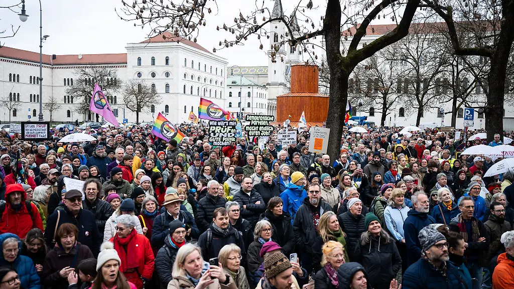 Mit Plakaten und lauten Rufen fordern 3.000 Menschen in München die Prüfung rechtsextremer Parteien. Die Versammlung verlief laut Polizei störungsfrei
