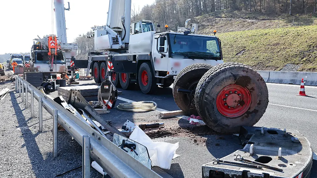 Der Kran war am Mittwochabend von der Fahrbahn abgekommen und umgekippt. Die Polizei geht von gesundheitlichen Problemen beim Fahrer aus. Der 72-Jährige wurde schwer verletzt, er musste von der Feuerwehr befreit werden. Der Schaden am Kran beläuft sich nach ersten Schätzungen auf mehrere Hunderttausend Euro.
