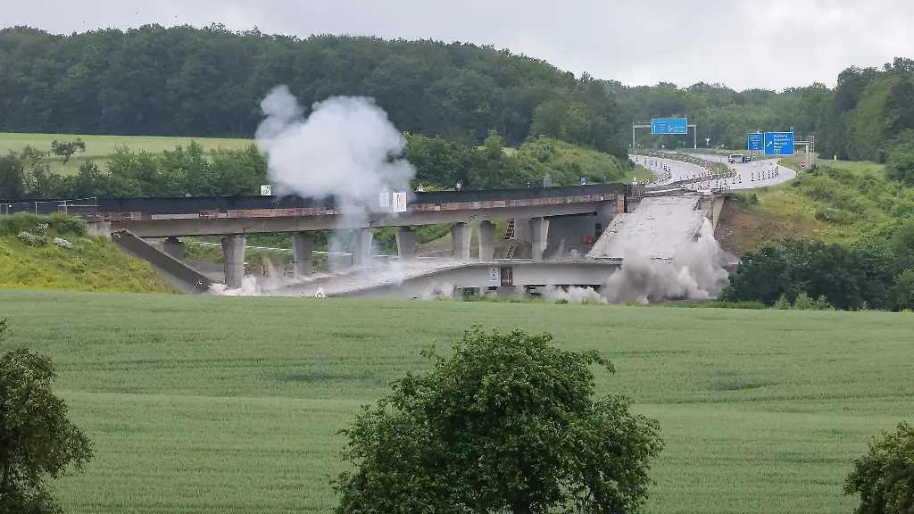 Mit der Sprengung an der Talbrücke Stettbach soll die Fahrbahn in Richtung Fulda im Zuge der Erneuerung abgebrochen werden. Rund um die Sprengung war ein Bereich von 300 Metern abgesichert worden.