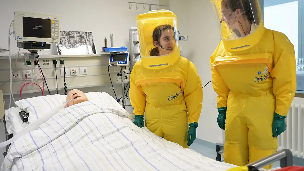 München (dpa/lby) - Alarmstufe rot: Ärzte und Pfleger arbeiten in luftdichten gelben Hochsicherheitsanzügen aus speziellem Kunststoff. Bis sie durch mehrere Druck-Schleusen beim Patienten sind, vergeht samt aufwendigem Ankleiden fast eine halbe Stunde. In der Sonderisolierstation 10d der München Klinik Schwabing sollen Patienten behandelt werden, die sich mit hochgefährlichen Erregern infiziert haben.