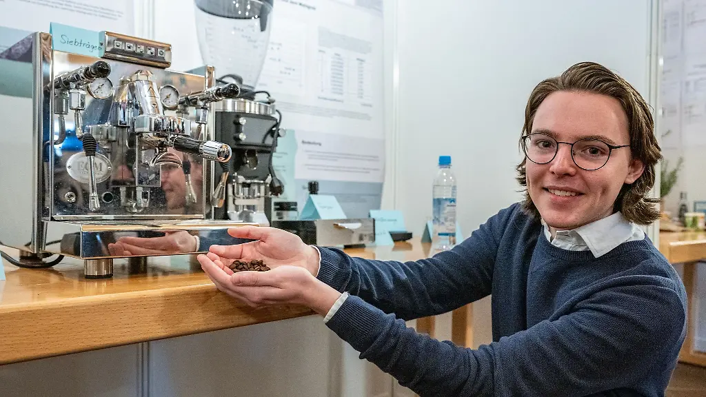 Valentin Schwer (18) aus Buchloe (Landkreis Ostallgäu) ist passionierter Espresso-Trinker und möchte ein Barista-Problem lösen. Nämlich: Wie kann man den Mahlgrad von Kaffeebohnen feststellen? Der Schüler fand heraus, dass der Mahlgrad an der Dichte der Kaffeebohne feststellbar sei. Nun müsste eine Kaffeemühle entwickelt werden, die daran ansetzt.