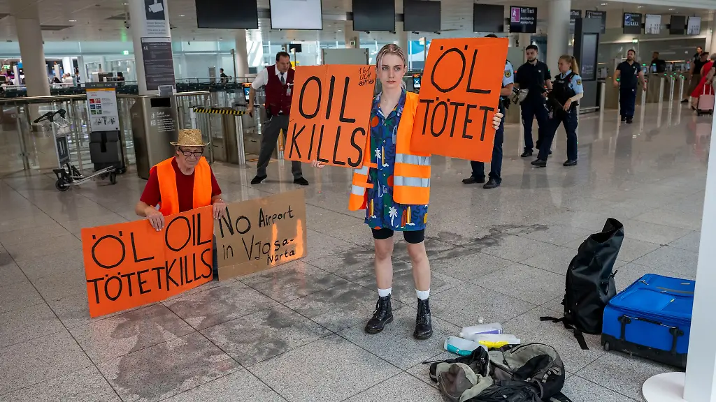 München (dpa/lby) - Sechs Mitglieder der "Letzten Generation" haben am Flughafen München gegen den Einsatz von Öl und Kerosin protestiert. Die Umweltaktivisten hielten im Terminal unter anderem ein großes Banner mit der Aufschrift "Öl, Gas und Kerosin treibt die Welt in den Ruin" hoch.