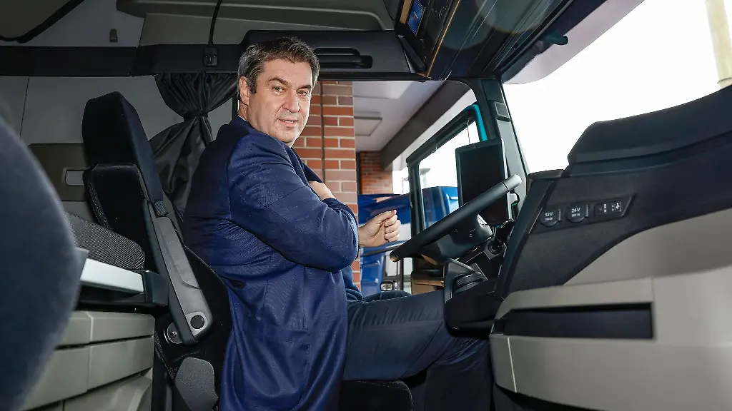 Bayerns-Ministerpraesident-Soeder-CSU-sitzt-am-Steuer-des-Etruck-Prototyps-von-MAN