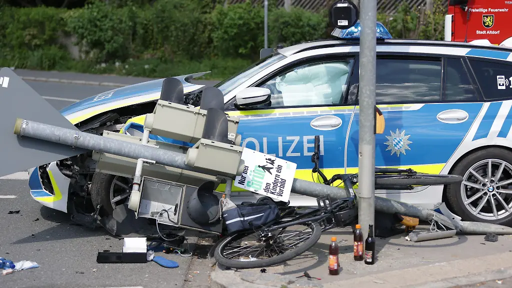 Altdorf bei Nürnberg (dpa/lby) - Ein neben einer Ampel wartender Radfahrer ist in Altdorf bei Nürnberg unglückliches Opfer eines Unfalls mit Polizeistreifenwagen geworden. Wie das Polizeipräsidium Mittelfranken mitteilte, war der Streifenwagen während einer Einsatzfahrt auf einer Kreuzung mit einem Auto kollidiert. Das Polizeiauto krachte in den Ampelmast, der in einem Dominoeffekt umknickte und auf das Fahrrad des 41-Jährigen stürzte.