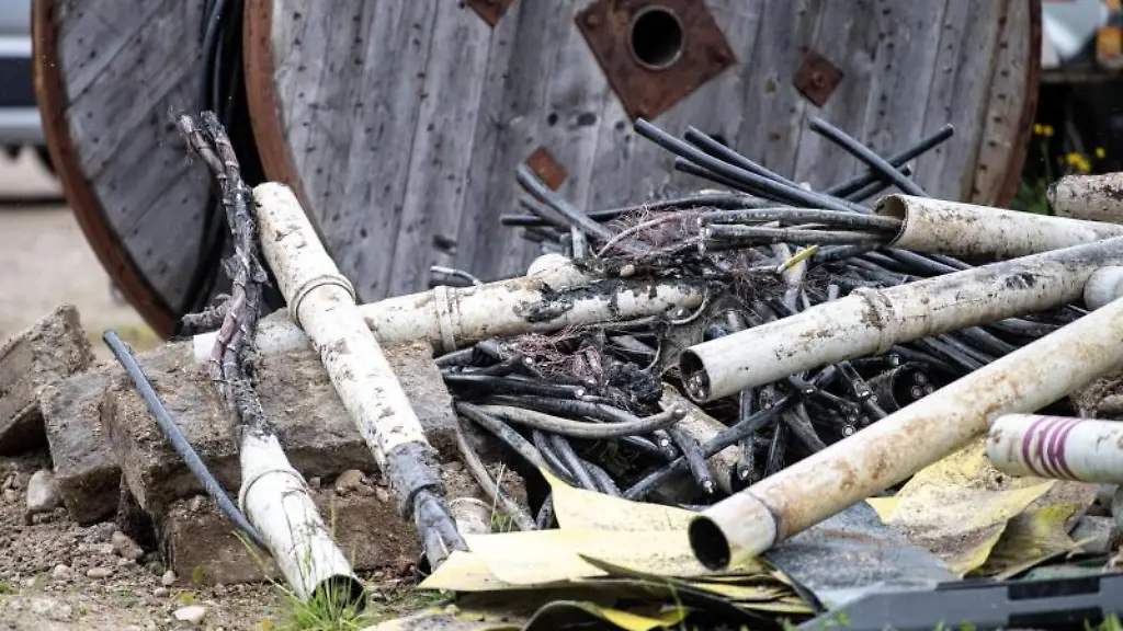 Beschaedigte-Stromkabel-liegen-neben-einer-Baustelle-an-der-in-der-vorhergegangenen-Nacht-ein-Kabelbrand-ausgebrochen-war