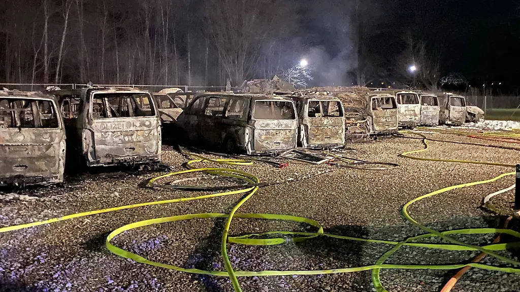 Wie die Feuerwehr mitteilte, war in der Nacht gegen 2.40 Uhr der erste Notruf eingegangen. Ein Anrufer meldete einen Brand in der Polizeidienststelle und mehrere Explosionsgeräusche. Als die Feuerwehr eintraf, seien die 23 Fahrzeuge bereits "in Vollbrand" gewesen. 45 Minuten dauerte es den Angaben zufolge, bis die 45 Einsatzkräfte alles gelöscht hatten.