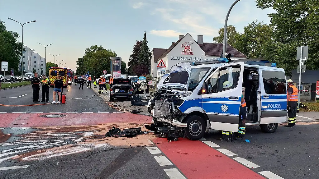 München (dpa/lby) - Beim Zusammenstoß eines Polizeiwagens und eines Autos an einer Kreuzung in München sind vier Menschen leicht verletzt worden. Nach Angaben der Feuerwehr brachte der Rettungsdienst eine 22 Jahre alte Polizistin und den 47-jährigen Fahrer des Autos am Donnerstag zur Behandlung in Kliniken. In dem Fahrzeug der Polizei befanden sich demnach zwei weitere Polizisten im Alter von 24 und 30 Jahren, die leicht verletzt wurden. Der 47-Jährige war bei dem Unfall im Bezirk Ramersdorf-Perlach alleine in seinem Auto. Der Polizei war mit dem Sprinter eigenen Angaben zufolge mit Sondersignalen auf dem Weg zu einem Einsatz.