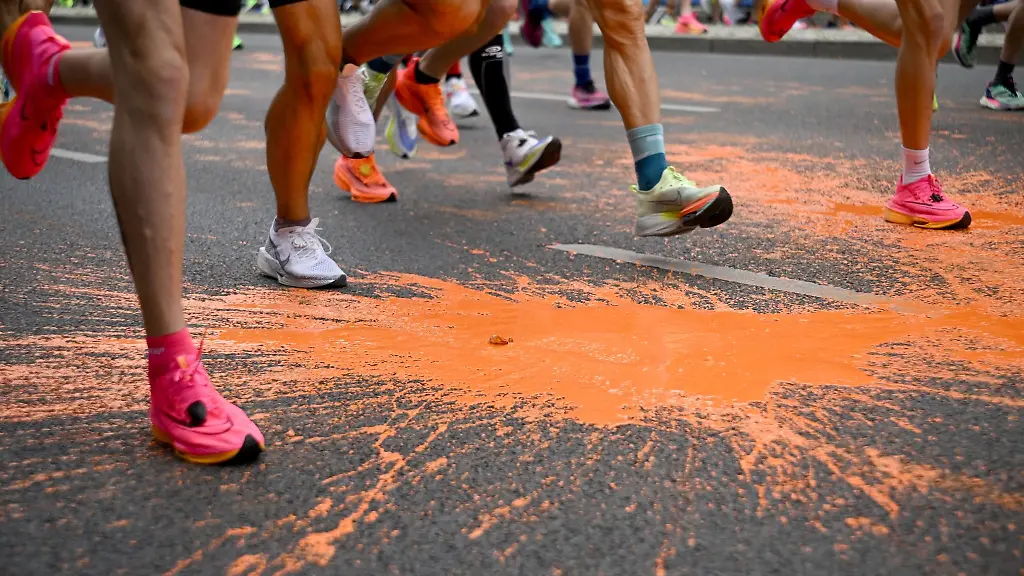 Kurz vor dem Start des Marathons am Sonntagmorgen nahe dem Brandenburger Tor waren einige Demonstranten auf die Strecke gestürmt. Sie verschütteten orange Farbe und wollten sich hinsetzen. Polizisten und Ordner zogen oder trugen sie schnell zur Seite. Zur Begründung hatte die Gruppe erklärt: "Wieso sind uns Weltrekorde wichtiger als die Lebensgrundlagen von Milliarden Menschen?"