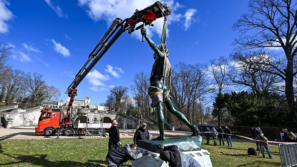 Potsdam (dpa/bb) - Mit dem "Bogenschützen" steht seit Montag eine der eindrucksvollsten Figuren des Parks Sanssouci wieder an ihrem Platz. Die 3,50 Meter hohe Figur war im Mai 2024 für eine umfassende Restaurierung nach Berlin transportiert worden, sagte ein Sprecher der Stiftung Preußische Schlösser und Gärten (SPSG). Nun hat sie ihren Platz im "Großen Parterre" unterhalb des Orangerieschlosses wieder eingenommen.